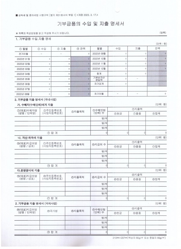 붙임1. 2022년 기부금 모금액 및 활용실적 명세서