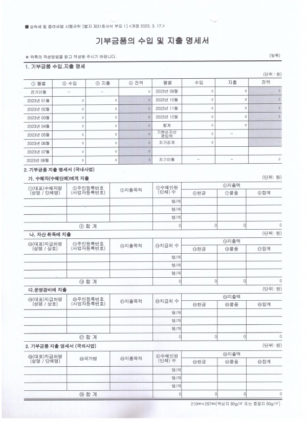 붙임1. 2023년 기부금 모금액 및 활용실적 명세서